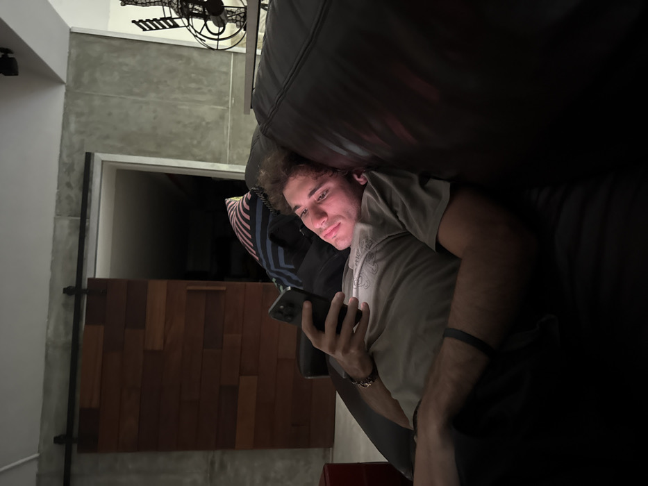 An individual, identified as male, reclines on a dark-colored couch in a dimly lit indoor environment within Key Biscayne, United States