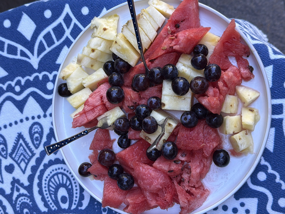A white circular plate contains an assortment of cut fruit. The plate is primarily filled with irregular pieces of red watermelon and diced pale yellow pineapple, interspersed with numerous dark purple grapes. Two small, decorative metal forks are partially embedded in the fruit; one possesses a dark handle adorned with light dots, and the other has a polished metallic handle. The plate rests on a blue and white patterned textile, featuring geometric and abstract designs. The background surrounding the textile is dark and out of focus. The scene is located in Vicente López, Argentina.