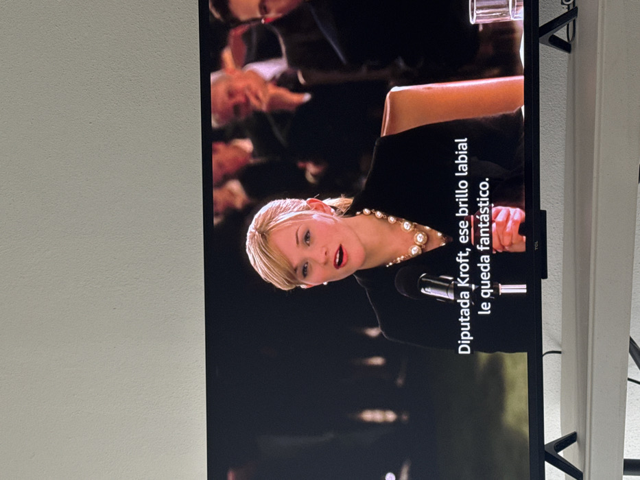 blonde woman with a pearl necklace speaking at a microphone. She is wearing a black top. The background is blurred, showing other people seated behind her. Spanish subtitles appear on the screen, reading "Diputada Kroft, ese brillo labial le queda fantástico." This image appears on a TCL television. The wall is painted off-white.
