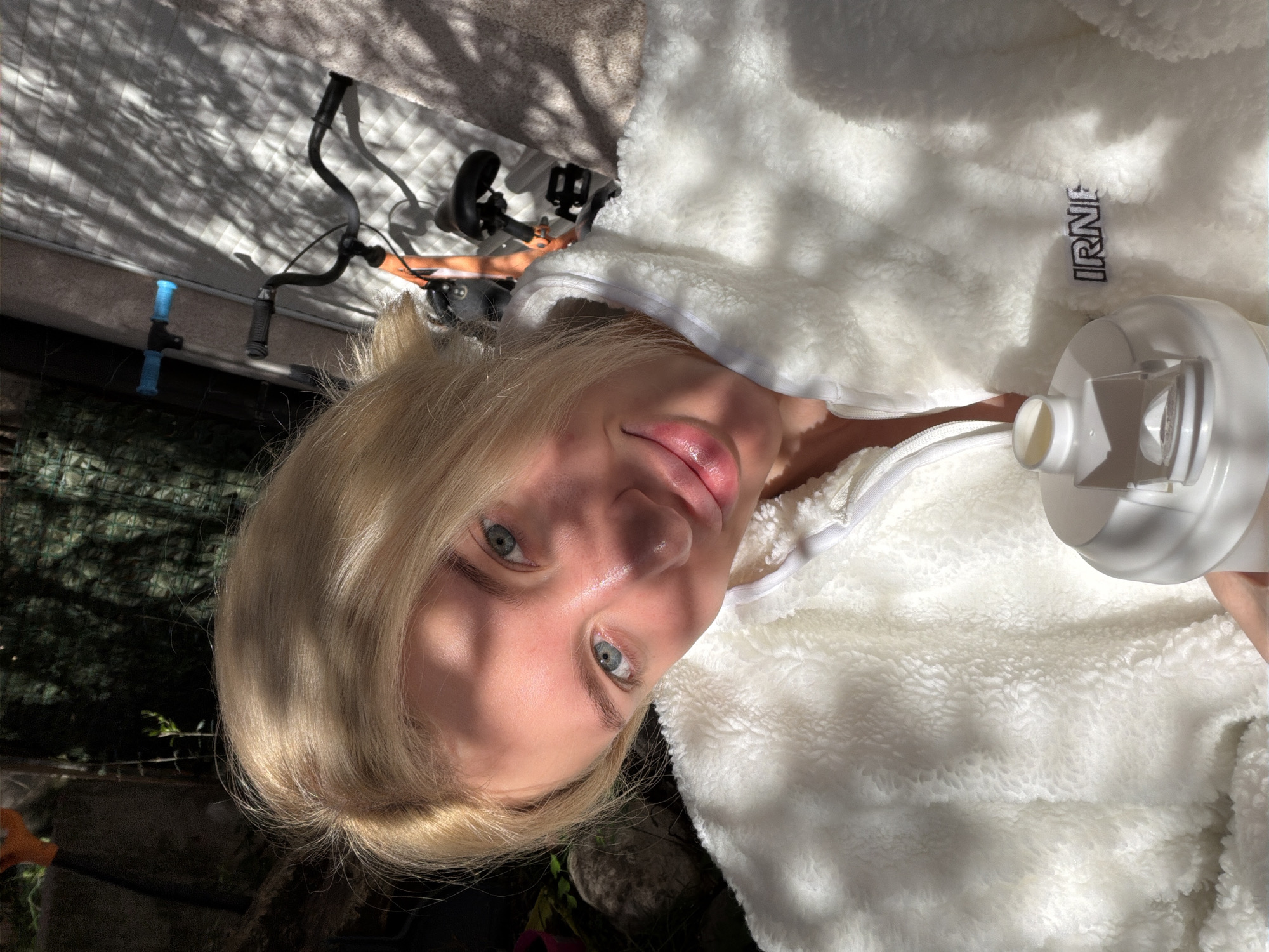 A blonde female individual with light-colored eyes is depicted in an outdoor setting, illuminated by direct sunlight which casts dappled shadows from overhead foliage onto her face and the background. She is smiling faintly and looking directly at the camera. She is wearing a white, textured, long-sleeved, zip-up jacket with "IRNE" embroidered in black letters on the right chest area. She holds a white cylindrical shaker bottle with an open lid in her right hand, positioned in the lower right foreground. In the mid-ground, behind and to the right of the individual, an orange bicycle with black handlebars, a black seat, and visible pedals is partially visible, positioned in front of a blue-handled scooter. A light-colored, possibly textured wall stands behind these vehicles. To the left of the individual's head, dark green foliage and a light-colored rock are present. The specific location within the city of Nerin, Montenegro, cannot be determined from the visual information provided.