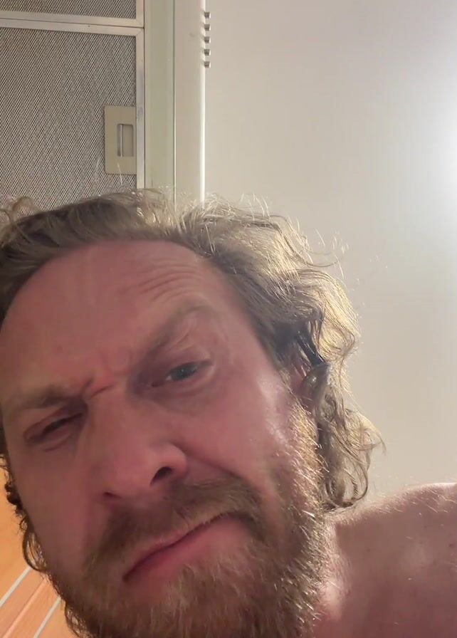 A shirtless man with a beard and disheveled hair is holding two oranges up to his eyes, obscuring his vision. He is looking directly at the camera, and the background includes a cabinet, a wall, and a vent.