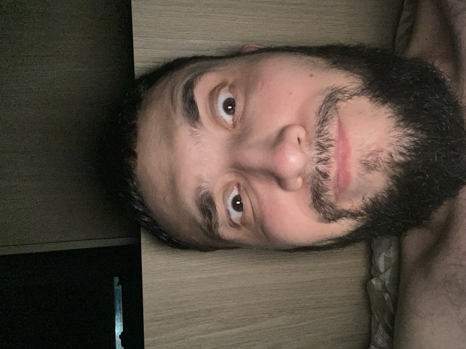 A close-up, tilted shot shows a bearded man's face. His dark hair is slicked back. He has light skin, brown eyes, and a full, dark beard. He is lying with his head on a light brown wooden surface. To the left, there is a dark shadowed area. To the right, glimpses of skin and white crumpled material suggest he may be bare-chested and lying on a bed. The man is looking directly at the camera with a neutral expression.