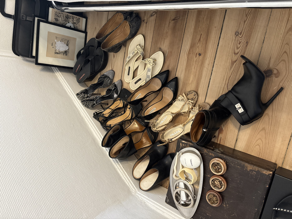 This image depicts an interior scene, likely a residential space, in Copenhagen, Denmark. The foreground and midground feature a collection of approximately 20 pairs of women's shoes and boots, arranged on a light brown wooden plank floor against a white textured wall with a matching baseboard. The footwear includes various styles such as black and brown leather high heels, strappy sandals (some gold-toned with snakeskin texture, one with "PRADA" visible on the insole), black platform flip-flops with "PRADA" on the strap, grey textured high heels, black and brown pumps, and dark grey ballet flats. A black leather peep-toe ankle boot with a silver buckle lies on its side in the lower-right foreground. To the lower left, a dark wooden box or trunk serves as a surface. On it rests a silver oval tray containing a white circular compact labeled "CHANEL," a cream-colored cuff bracelet, and silver metal jewelry items. Adjacent to the tray are three small, round, light brown wooden containers, each holding dry, fragmented botanical material. In the upper-right background, two framed art prints lean against the wall; the larger one features an abstract white form on a light background, set within a dark frame and white mat. Above and behind these frames, a black leather-like briefcase or bag is also leaning against the wall.