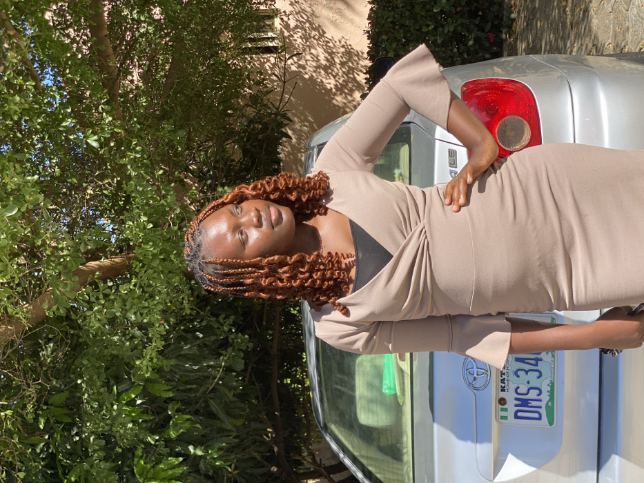 A young adult female is depicted standing outdoors in Dabawa, Nigeria, positioned to the left of a silver Toyota Corolla sedan