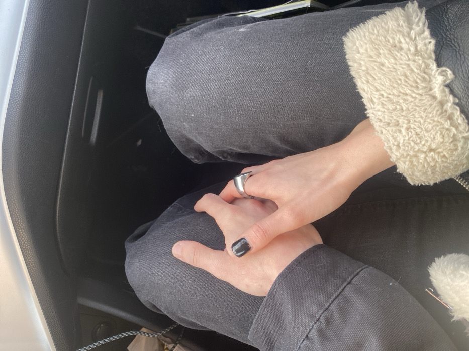 A high-angle interior shot depicts two individuals holding hands inside a vehicle located in Seclin, France. The perspective is from above the individuals' laps. The individual on the left wears dark grey or black jeans and a dark-colored long-sleeved garment, possibly a jacket. Their bare left hand is clasped within the other individual's right hand. The visible thumb of the left hand features black nail polish. The individual on the right also wears dark grey or black jeans and a black jacket with a prominent cream-colored faux shearling or fleece cuff on the right wrist. Their bare right hand is holding the left individual's hand, and a silver-toned signet ring is worn on the right ring finger. The upper background reveals the dark grey or black plastic interior of the vehicle's dashboard or glove compartment area. A white or light-colored horizontal strip, possibly a ceiling or upper window frame, is visible at the very top edge. A black braided cable is partially visible on the far left, hanging down. Natural light illuminates the scene from an unseen source.