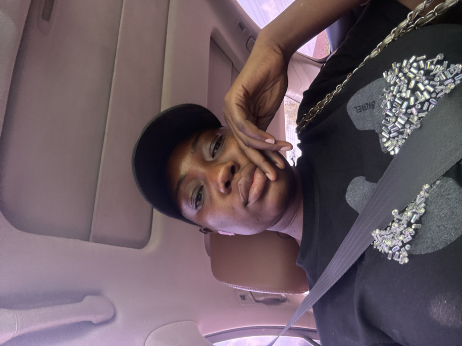 A single individual, identified as female, is seated inside a vehicle. The location is specified as Galadimawa, Nigeria. She is wearing a black baseball cap and a black t-shirt adorned with multiple silver-toned, bead-like embellishments arranged in clusters on the chest. A black seatbelt is positioned across her torso, from her left shoulder to her right hip. A light pink earbud is visible in her right ear. Her left hand is resting against her jawline with her fingers positioned near her mouth. The vehicle's interior features a brown upholstered headrest behind her and a light-colored ceiling with a visible sunroof. The exterior visible through the vehicle's windows is indistinct and blurred.