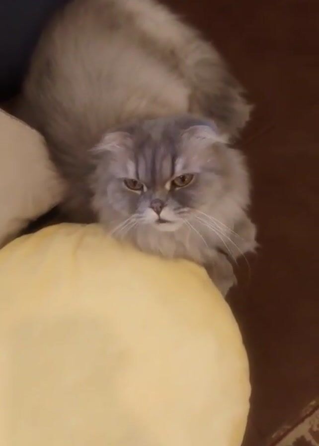- "A cat, lying on a yellow circular pillow, opens its eyes and then moves away from the pillow to lie on a dark brown surface" by FM-o4pOG2, licensed under CC BY 4.0