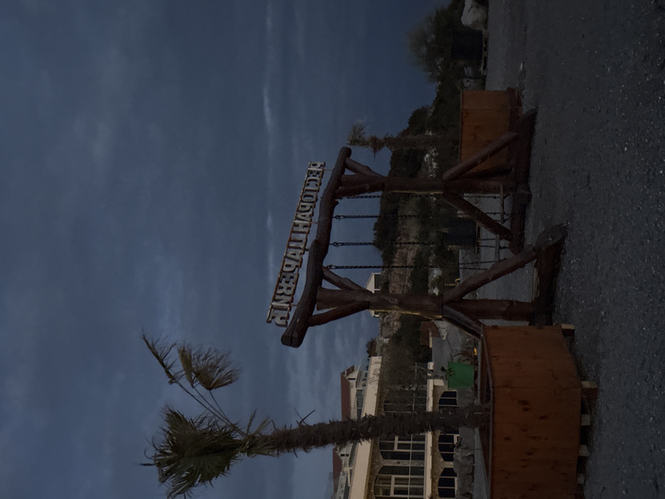 The image displays an outdoor scene in Kovačko Polje, Montenegro, under a dark, overcast sky consistent with twilight or night. The foreground consists of a dark, granular ground surface. On the left, a slender palm tree is situated within a rectangular brown wooden planter. Centrally positioned is a large, rustic wooden structure composed of two A-frame supports connected by a horizontal beam. An illuminated sign with Cyrillic text, which reads "РЕСТОРАН / ХОТЕЛ" (Restaurant / Hotel) when viewed correctly, is mounted on the beam, appearing reversed in the image. Multiple chains hang from this beam, with two dark, empty swing seats partially visible. Another identical brown wooden planter is located to the right of the wooden structure. In the midground, behind the central elements, a multi-story building with a light-colored facade and arched ground-floor windows is partially visible on the left. To the right of this building, a vegetated hillside ascends, featuring a small white building with a red roof at its crest. No individuals are present.