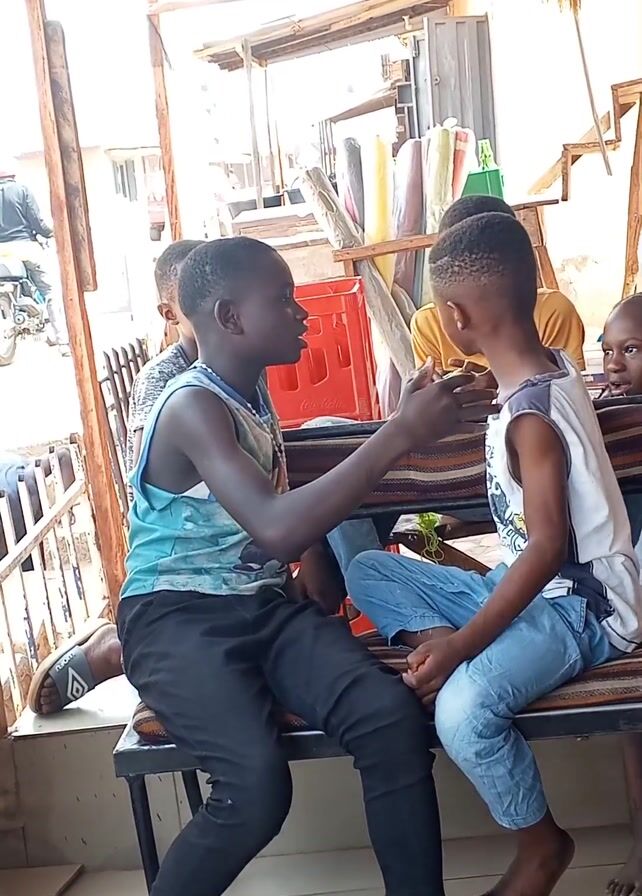 four children sitting on a bench in what appears to be a shop or covered outdoor space. Two of the boys, dressed in tank tops and jeans or dark pants, are engaged in a conversation with hand gestures. A third child, also a boy, sits between them but looks away. A girl with braided hair sits on the end of the bench, also looking away. The bench has a striped cushion. Behind them are shelves with various items, including rolls of fabric and a red plastic crate. A mop is hanging from the ceiling. A person can be seen walking in the background outside.