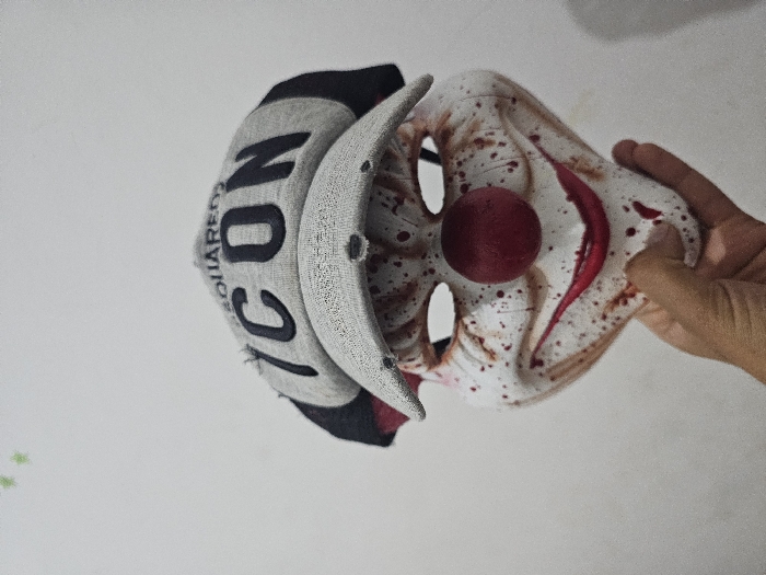 A gray and black baseball cap with "ICON" lettering is next to a white clown mask. The clown mask has a red nose, red lipstick, and red markings resembling blood spatter and cuts. A hand holds the right side of the mask. The background is a plain white wall, and the objects are positioned horizontally.