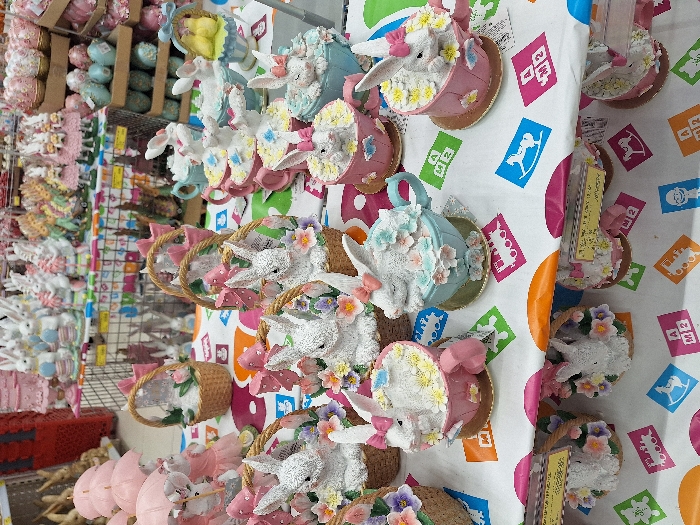 This image depicts a retail display of Easter-themed merchandise within a store in the city of Unknown, Bulgaria. The central focus is a white table covered with a patterned tablecloth featuring colorful silhouettes of children's toys (trains, rocking horses, blocks). On this table, numerous decorative figurines are arranged. These are predominantly white ceramic or resin rabbits, approximately 15-20 cm in height, presented in two main styles: rabbits sitting inside pastel pink or light blue teacups adorned with small artificial flowers (yellow, pink, blue) and bows; and rabbits sitting within small woven baskets, also decorated with artificial flowers. Several identical figurines are visible, arranged in rows, some with yellow price tags attached. In the background, additional retail shelving units display more Easter decorations, including rows of similar rabbit figurines with pastel accents, stacks of pastel-colored decorative eggs (pink, blue, green), and other assorted items such as pink mini-parasols and wooden figures. A red container or cart is partially visible on the far left. The environment is well-lit, typical of an indoor retail setting. No individuals or actions are depicted in the scene.