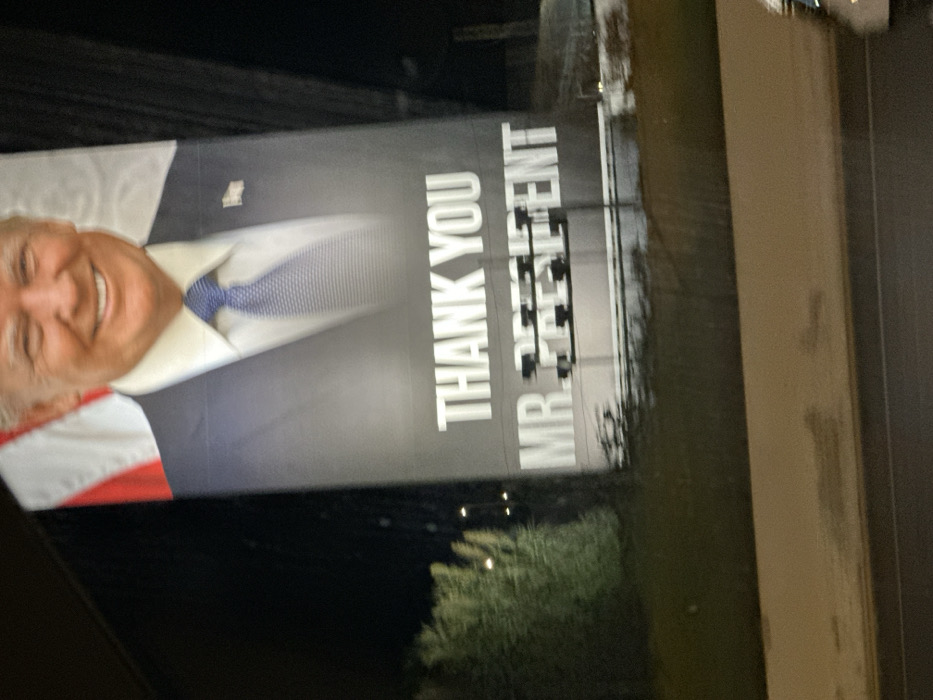 The image displays a large, illuminated vertical billboard at night, viewed from an elevated perspective, likely from a moving vehicle. The billboard features a smiling headshot of Donald Trump, dressed in a dark suit, white shirt, and blue patterned tie, with a small American flag pin on his lapel. A portion of the American flag is visible behind his left shoulder. Below the portrait, large white sans-serif text reads "THANK YOU" above "MR. PRESIDENT". The word "PRESIDENT" appears partially obscured or distorted in its initial letters. To the left of the billboard, dark, leafy foliage is visible. Below the billboard, a light-colored concrete barrier separates the foreground from a dark road surface. A small section of a white vehicle is partially visible in the bottom right corner. The scene is located along the Ayalon Highway (Highway 20) in Tel Aviv, Israel.