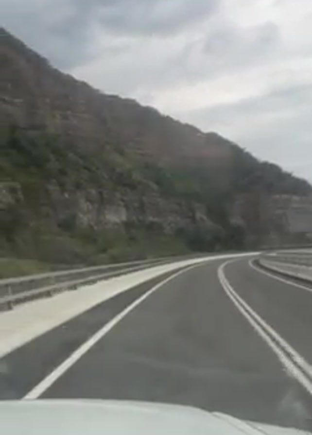 car driving on a highway along a rocky, forested cliffside on a cloudy day. The road curves, and the car passes by a barrier on the right-hand side, revealing a view of the ocean beyond. The footage is taken from the perspective of someone inside the car.