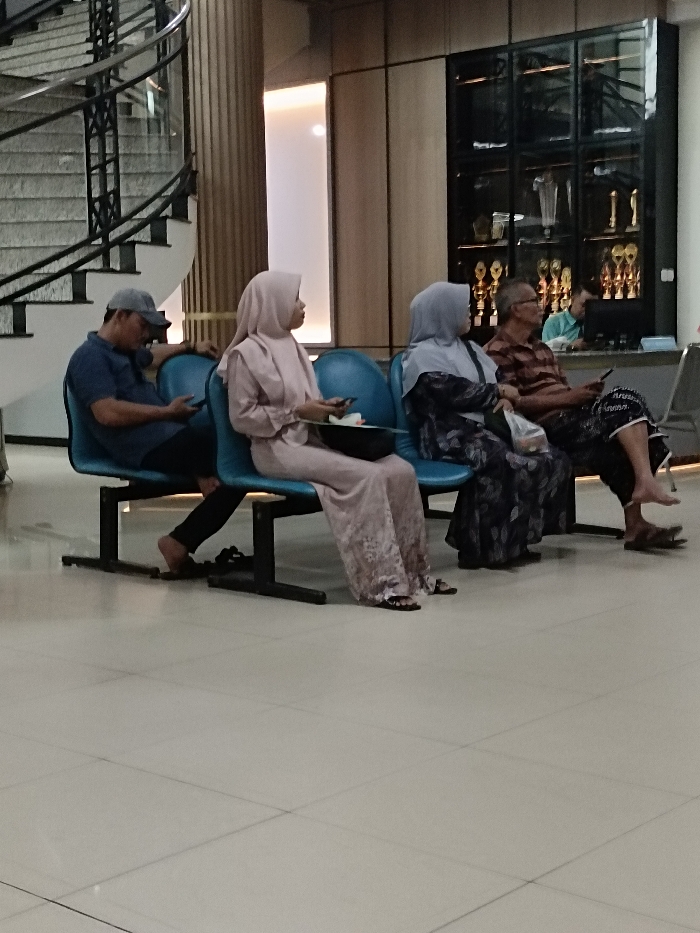 Four individuals are seated on a row of blue waiting chairs in an indoor waiting area in Margorejo, Indonesia
