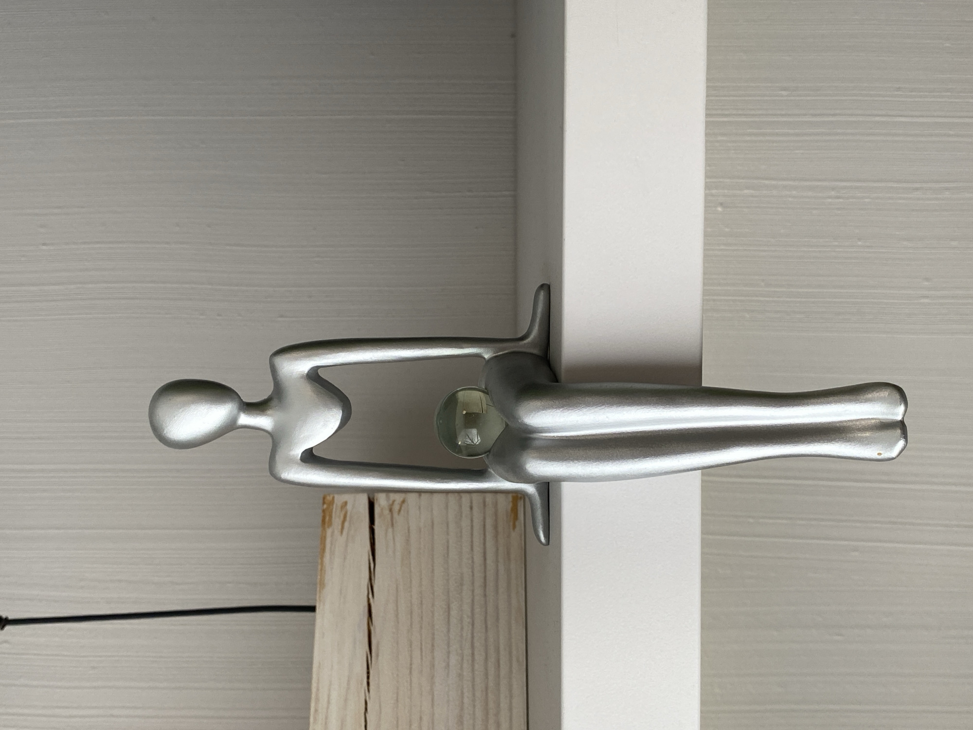 This image presents a static indoor scene in Votkinsk, Russia. A stylized, metallic silver figurine, gender-neutral and featureless, is centrally positioned, seated on a white, flat shelf. The figurine holds a translucent, pale green glass orb between its knees. To the left of the figurine, on the same white shelf, a rectangular light-colored wooden box displays horizontal wood grain. A thin black cable extends vertically upwards from behind the wooden box, contrasting against the background wall. The wall features a subtle, light-colored vertical striped or textured pattern. The area below the shelf in the foreground is also white.