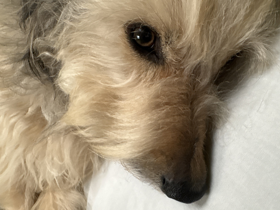 A close-up view captures the head of a domestic canine resting on a white, soft textile surface. The dog's fur is predominantly shaggy, light blonde to tan, with noticeable dark greyish strands interspersed throughout. Its right eye, a dark brown iris with a reflective highlight, is prominently visible on the right side of the frame. To the left, the dog's black, moist nose, displaying two visible nostrils, is in softer focus. The animal appears still, suggesting a state of rest or observation. This scene is situated in the city of Barcelona, Spain.