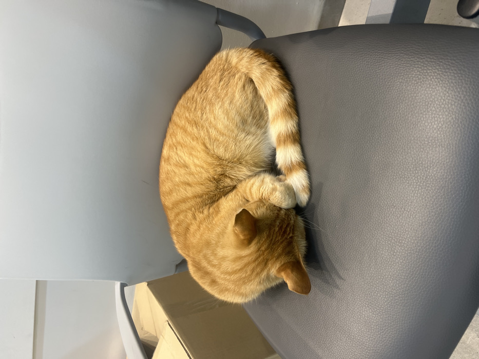 - "An orange tabby cat is observed sleeping in a tightly curled position on a dark gray office chair" by FM-Ve2st1, licensed under CC BY 4.0