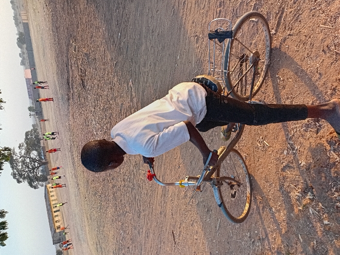 The image portrays an outdoor scene in Nata-Ala, Nigeria. In the immediate foreground, an individual of apparent African descent, wearing a white short-sleeved t-shirt and dark trousers, stands barefoot next to a dark-colored bicycle. The person is oriented away from the camera, with their head slightly turned to the left, observing the activity in the background. The bicycle features a front fender, rear fender, a rear luggage rack, and a bell on the handlebars. The ground beneath the subject and bicycle is reddish-brown dirt with scattered small debris. In the midground, a large, open, unpaved field extends. Approximately 15-20 individuals are visible on this field, engaged in what appears to be a football game. Participants are distinguished by light orange and light green/yellow colored jerseys. To the left side of the field, a long, light-colored building with multiple windows is present. A prominent, large tree with an extensive canopy stands in the central background, beyond the football field. Additional sparse vegetation and distant structures are visible on the horizon under a hazy sky, with long shadows cast across the dirt ground, indicating a low sun angle.