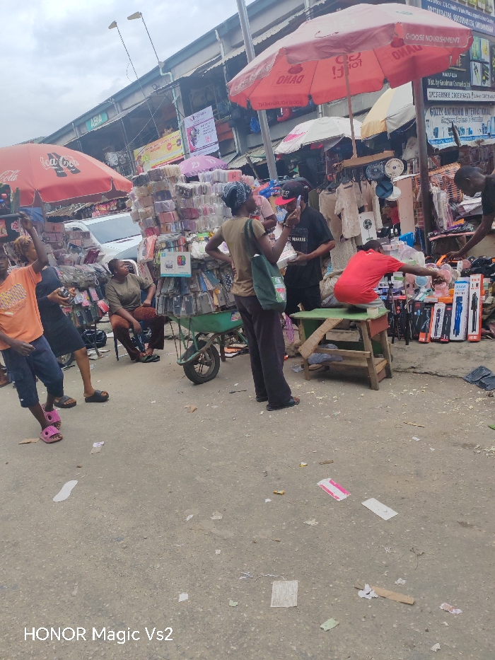 - "The image portrays an active outdoor market scene in Satellite Town, Nigeria, under an overcast sky" by FM-NPexB3, licensed under CC BY 4.0