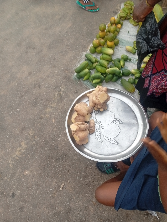 The image depicts an outdoor market scene on a dark gray paved surface, consistent with concrete or asphalt, in Umuode, Nigeria. In the foreground, the lower half of a person is visible, wearing dark blue shorts and black flip-flops with green accents. This individual holds a round, silver-colored metal tray containing several irregular light brown ginger roots. The tray features an embossed or etched design of two fruits and foliage. To the right, another person's arm and a portion of their lower torso are visible. This individual wears a patterned red and black garment and a gold-colored bracelet, with their hand positioned near a display of produce. The produce, arranged on a light-colored mat or sack on the ground, includes a large pile of green cucumbers, a smaller stack of greenish-yellow round fruits resembling small citrus, and a cluster of pale green starfruits. A crumpled black plastic bag is situated among the produce. In the upper left corner, a foot wearing teal and white striped flip-flops is partially visible.
