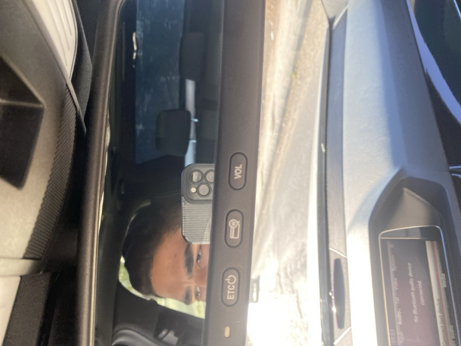 A car interior is visible. In the driver's side mirror, a person is taking the picture. The mirror frame has buttons labeled "ETC", a symbol, and "VOL". Part of the dashboard is visible, as is the seat and headrest. The infotainment screen displays the text "No Bluetooth audio device connected." The image is rotated.