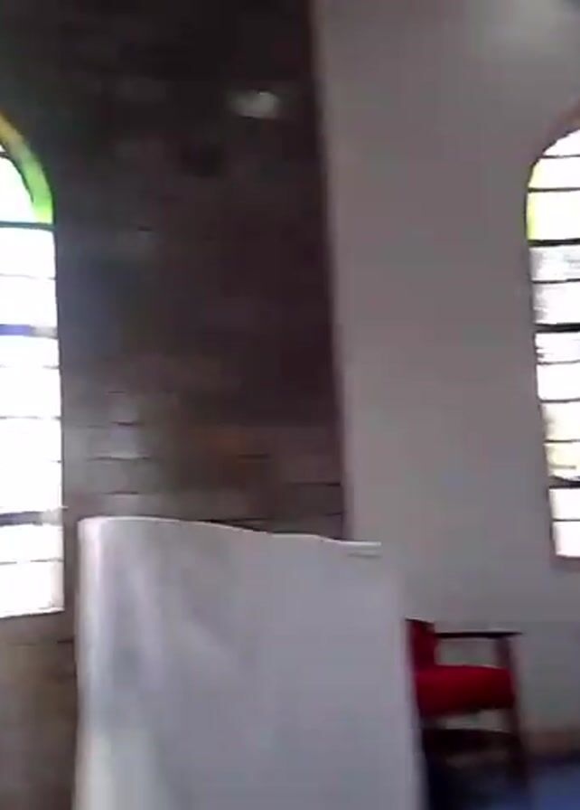 n interior of a church. The first scene shows a view of a wall with a window, four red chairs, a brown podium, and a blue crate. There is a poster on the wall behind the podium. The next shot is a closer view of the windows on the side of the church, with some windows having colored stained glass. The camera then pans to a wide shot of the interior showing rows of wooden pews and additional windows. The camera then focuses again on a row of arched windows with what appears to be a wall of gray bricks.