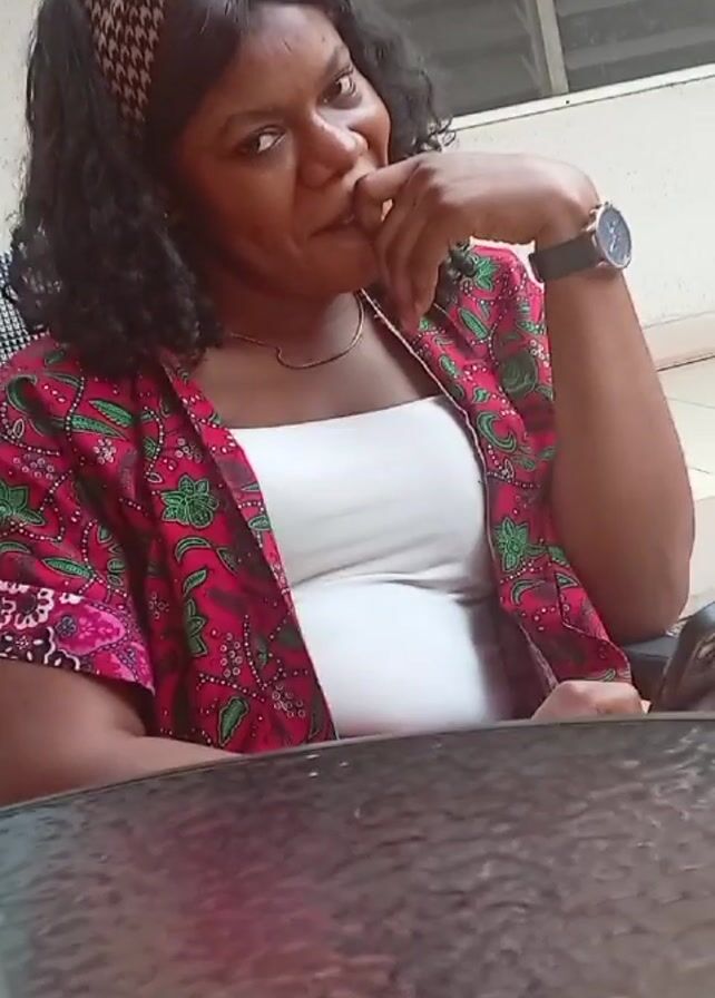 A woman sits at a glass table, wearing a white top and a red and green patterned shirt. She has a patterned headband on her head and a watch on her left wrist. She rests her chin on her left hand and looks to the right, then down. She appears to be thinking or contemplating something. The background includes a white wall and a window.