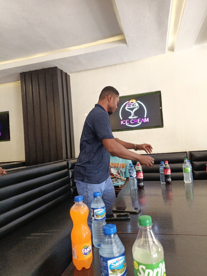 An indoor scene in Darmanawa, Nigeria, depicts a commercial establishment, likely an ice cream parlor or cafe. A dark-skinned adult male, wearing a navy blue polo shirt and light blue jeans, stands facing right with his arms extended forward, seemingly interacting with items on a large, dark rectangular table. His hands are positioned over several plastic beverage bottles, which include Fanta, Sprite, Coca-Cola, and multiple bottles of bottled water, all resting on the table. Two dark-colored smartphones are also on the table surface. In the background, to the left of the standing male, a portion of another individual, wearing a light-colored patterned shirt, is visible seated at the table. The establishment features black, ribbed booth seating along the wall. Above the seating, a rectangular sign displaying a neon-lit ice cream sundae graphic and the text "ICE CREAM" is mounted on a light-colored wall, framed by artificial green turf. A dark, fluted architectural column is visible on the left side of the frame. The ceiling is white with recessed decorative elements.