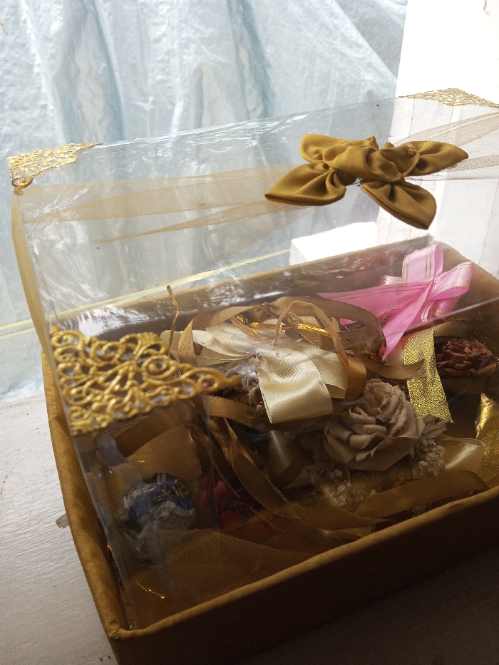 A rectangular, decorative gift box is centrally positioned on a light-colored, possibly painted wooden surface, likely a windowsill, in Qarabucaq qəsəbə, Azerbaijan. The box features a gold-brown fabric-covered base and a clear plastic or cellophane lid. The lid is adorned with gold sheer ribbon, gold ornate filigree corner accents on at least two visible corners, and a prominent pleated gold fabric bow secured to the top right. Contents inside the box are visible through the clear lid: an assortment of satin and sheer ribbons in gold, cream, and pink; multiple fabric rosettes/flowers in beige and taupe shades; small clusters of white dried floral elements; and at least one foil-wrapped confection in blue and silver. The background is blurred, showing a window covered by a light-colored, translucent, possibly rippled curtain. No individuals are present, and no actions or interactions are depicted.