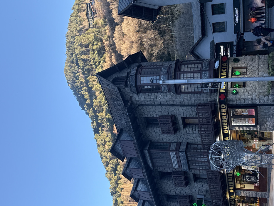 An angled view of a stone building with a peaked roof and multiple windows sits adjacent to a mountain covered in trees. To the right, signs for "Farmacia Guerrero" and "Viladomat" are visible above a storefront. A wire sculpture stands in front. People are walking nearby. The sky is blue and the trees on the mountain cast shadows.