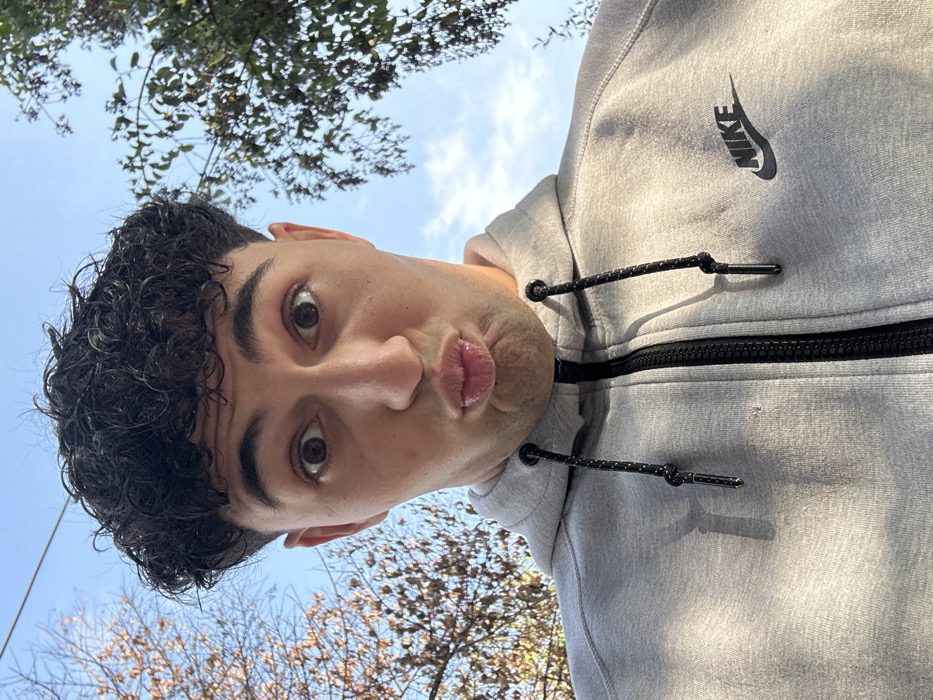 A male subject is depicted in a medium-close-up, low-angle selfie, outdoors in Al-Qaboun Municipality, Syria. The individual possesses dark, curly hair, brown eyes, and is looking directly at the camera with a wide-eyed expression and pouted lips. He wears a grey zippered hoodie with black drawstrings featuring white flecks and black metallic tips. A black "NIKE" logo is visible on the left chest area of the hoodie. The background shows a clear blue sky. To the left, a tree with brown, sparse foliage is visible. To the right, dense green foliage from another tree is present. The lighting suggests daylight conditions.