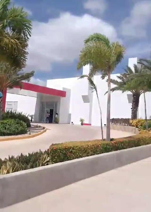 pan across a building exterior with landscaping. The building is primarily white with some red accents. There are palm trees and other plants in concrete planters and garden beds. The parking lot has a few cars and a light pole. A person is walking towards the building on a ramp. There are mountains visible in the distance. The sky is blue with white clouds.