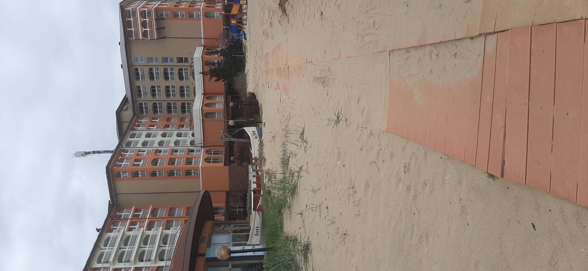 The image depicts a sandy beach leading up to a large multi-story building with multiple windows and a curved architectural design. Adjacent to the beach is a wooden boardwalk. The location is Obzor, Bulgaria. There are no people visible in the scene. Objects include a building, sand, boardwalk, and a boat.