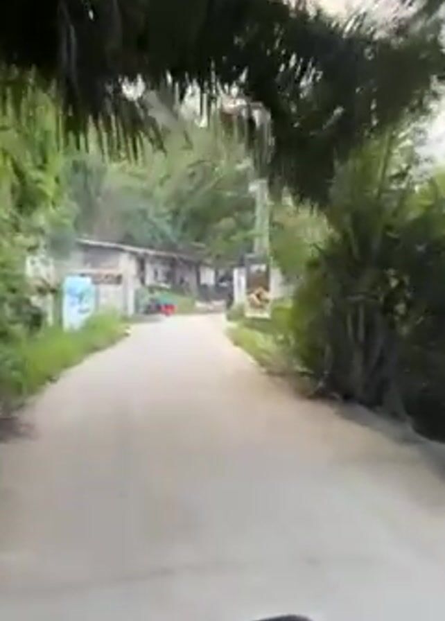 low-angle view from a moving vehicle, likely a motorcycle, driving down a narrow paved road. The road is lined with lush green vegetation on either side, including trees and bushes, some of which overhang the road, creating a tunnel effect. The sky is cloudy. On the left side of the road, there's a low concrete structure, possibly a building or a wall, with some graffiti on it. Beside the structure, a green tuk-tuk is parked. On the right side of the road, a utility pole stands with electrical wires running across the street. A sign is attached to the pole with Chinese characters on it. A crane is visible behind the utility pole. The vehicle continues down the road, providing a glimpse of the surroundings.