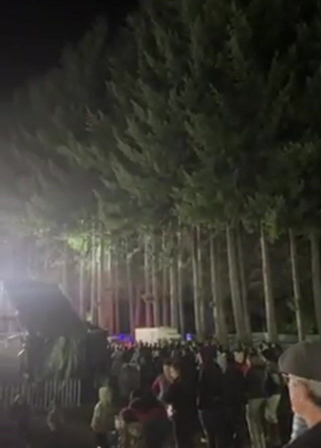 A crowd is gathered in front of a stage at night with very tall trees towering behind the audience and the stage. The stage is lit with bright lights and what appear to be LED screens. There are people on the stage, presumably performers, although it is difficult to make out who they are. The camera pans up and slightly left to show the stage better before ending.