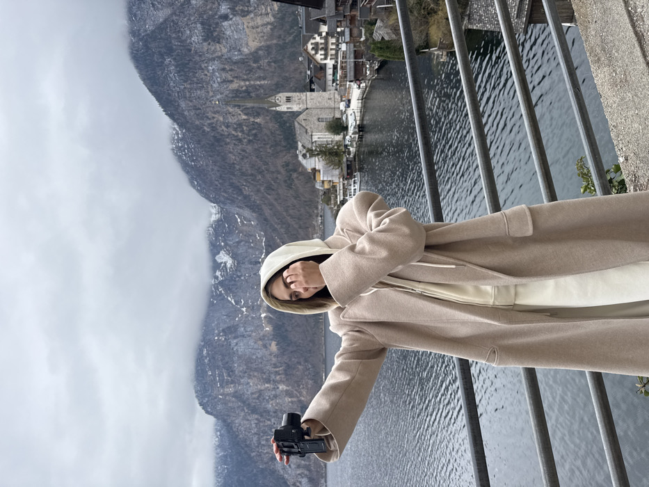 An individual stands outdoors on an elevated platform, positioned behind a dark gray metal railing, in the village of Hallstatt, Austria. The person, wearing a long, light beige overcoat over a cream-colored hooded sweatshirt and pants, holds a black digital camera in their extended right hand, angled towards themselves as if taking a selfie or recording video. Their left hand is raised near their face. Behind the individual, the dark, rippled waters of Hallstätter See extend to a narrow strip of the village, dominated by a light-colored stone church featuring a tall, pointed spire and clock tower. Numerous traditional buildings with dark roofs are clustered along the waterfront and ascending the lower mountain slopes. Several small boats and at least one larger white vessel are visible on the lake near the village. Steep, rugged mountains, partially covered in bare trees and patches of snow near their peaks, rise directly from the lake on the opposite shore. The sky is overcast and gray, with low clouds obscuring some mountain tops.
