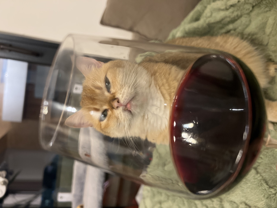- "A tan cat lies within a large wine glass filled with red wine" by FM-aQUtB3, licensed under CC BY 4.0