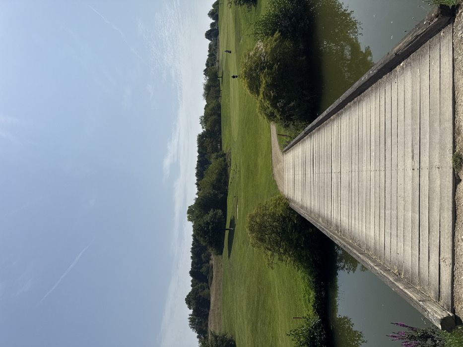 The image depicts a golf course located in Lenningen, Luxembourg, under clear daylight conditions. In the foreground, a wooden pedestrian bridge extends towards the viewer, spanning a calm body of water that reflects the sky and surrounding vegetation. The bridge's surface is composed of light-colored wooden planks laid perpendicularly to its length, with darker wooden beams forming the sides. Purple flowering plants are visible on the left bank near the bridge's base. Beyond the bridge, a light-colored dirt path curves to the left, leading onto a manicured green golf course. The course features scattered trees and shrubs, including a prominent standalone tree in the mid-left area. Two individuals are visible on the course: one figure in dark attire is walking in the mid-right, and another figure further in the background appears to be pushing a golf caddy or bag. The background consists of a dense line of trees forming the horizon, beneath a vast, light-blue sky with faint white contrails. The overall scene indicates fair weather and a recreational environment.