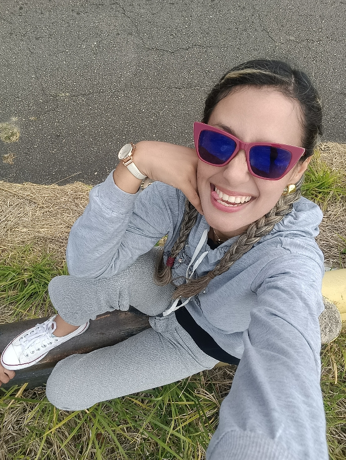An adult female is depicted in a high-angle selfie, seated outdoors in the city of Sabaneta, Venezuela. She has light brown skin, dark hair styled in two long braids with lighter highlights, and is wearing pink cat-eye sunglasses with blue reflective lenses. A white-banded, gold-toned watch is on her left wrist, and a gold-colored earring is visible in her right ear. She is dressed in a gray hooded sweatshirt, a black undershirt, and gray sweatpants. White canvas sneakers are on her left foot. Her left hand rests near her chin as she smiles broadly at the camera with her tongue slightly out. She is sitting on a dark, rough-hewn log or beam. The immediate ground cover consists of dry, yellowish-green grass and patches of earth. A cracked asphalt surface is visible in the background, and a yellow-painted metal post or pipe is partially visible to her right side.