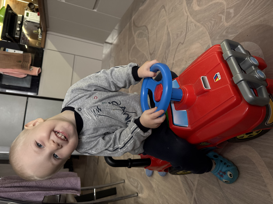 - "A young, fair-skinned child with blonde hair and blue eyes is seated on a red plastic ride-on toy resembling a truck in what appears to be a kitchen located in Vereshchagino, Russia" by FM-w9Rpx2, licensed under CC BY 4.0