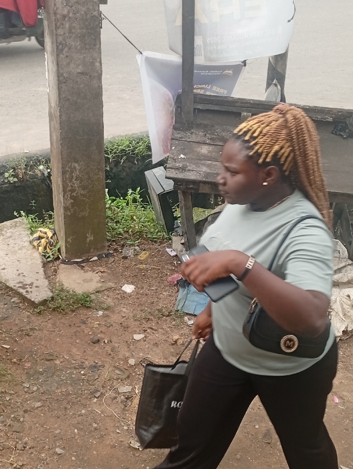 A woman walks from right to left on a dirt path in Aba, Nigeria. She has dark skin, blonde twisted hair in a high ponytail, and wears a light green t-shirt, dark trousers, a black shoulder bag with a gold 'M' emblem, a gold earring, and a gold-colored bracelet. She holds a black mobile phone in her right hand and a black shopping bag (partially legible "RO...") in her left hand. To her left, a weathered concrete pillar stands next to a small ditch with green vegetation. Further left, a portion of a red scooter is visible on a paved road. To her right, a makeshift wooden stand displays several white posters with black text. The ground is reddish-brown dirt with scattered debris and sparse greenery.