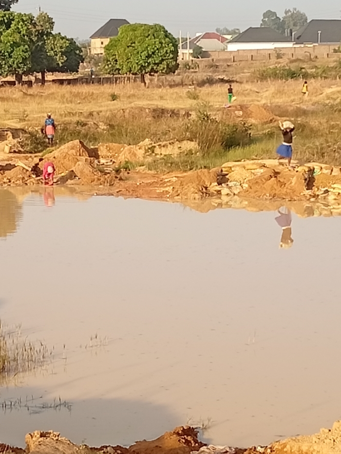 A muddy pond dominates the foreground, reflecting figures standing on dirt banks. In the background, individuals move across a dry, grassy landscape dotted with trees. Some are carrying objects on their heads. Houses are visible beyond the field, adding a touch of civilization. The scene suggests a community reliant on natural resources.