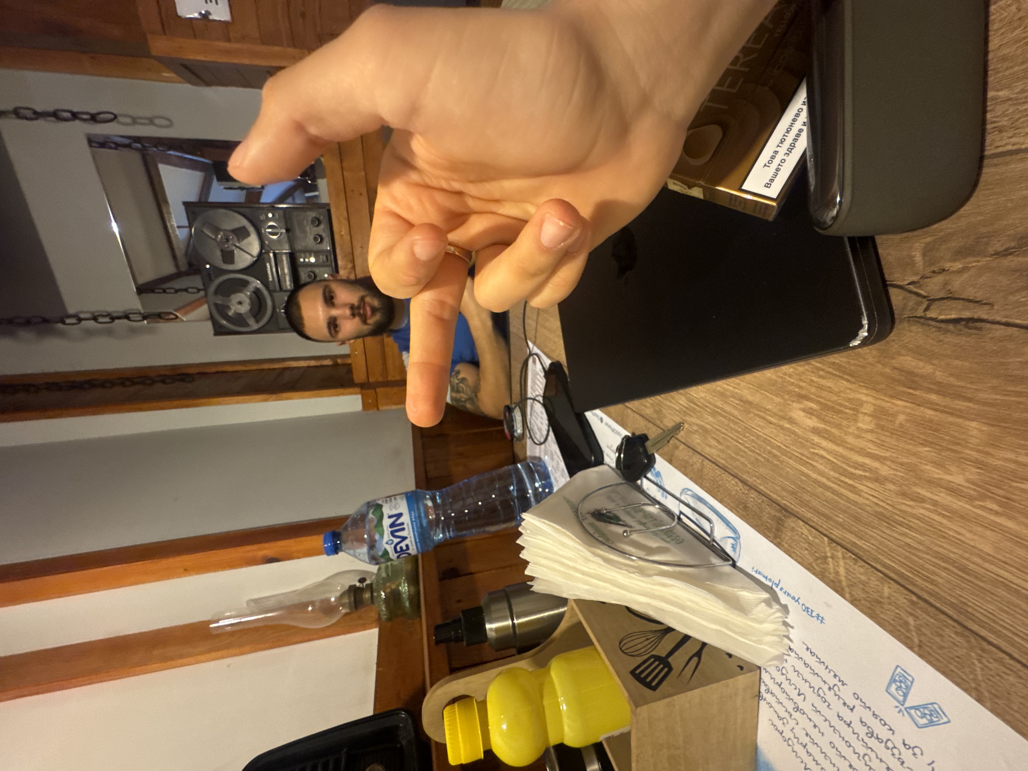 A table scene features a person with a beard reflected in a mirror with a vintage tape recorder, and a hand giving the peace sign above various objects. The objects include: a black phone, a pack of cigarettes, eyeglasses, keys, a bottle of "DEVIN" water, an oil lamp, a metal shaker, a yellow bottle, a wooden container with cooking utensils, and a paper with blue writing "#130 years plomat." The locale is identified by the water bottle brand as Kostinbrod, Bulgaria.