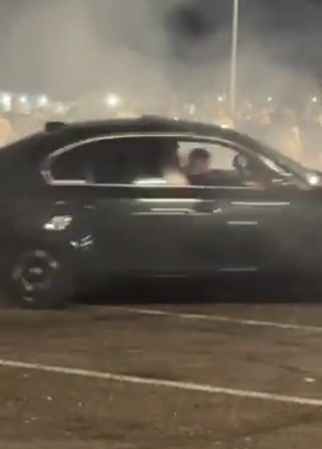 A black BMW sedan performs a burnout in an empty parking lot at night