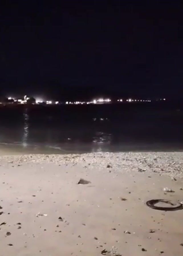 beach at night. The sand is pale and littered with debris, including a tire. The water is dark, with gentle waves lapping the shore. In the distance, lights from buildings are visible along the coastline. The overall atmosphere is quiet and still.