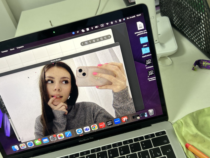 This image depicts an indoor scene in Novosergievka, Russia, focusing on a silver MacBook Pro laptop positioned on a light-colored desk. The laptop screen displays a macOS interface, indicating the date "Tuesday, November 4th, 16:31" in Russian. An active "Photo Booth" application window occupies a significant portion of the screen, showcasing a live webcam feed. Within the Photo Booth window, a young female with long dark hair, wearing a grey turtleneck sweater, is captured. She holds a light-colored smartphone with two camera lenses in her right hand, which has bright pink nail polish, in a selfie-taking posture. Her left hand has an index finger positioned near her mouth, and she is looking towards the upper right of the frame with her mouth slightly ajar. The background of her image within the webcam feed is a plain, light-colored surface. To the right of the laptop on the desk, a black mesh organizer, a white electronic device, a crumpled light green fabric, an orange and pink marker, and a purple and green candy wrapper (labeled "Крокант") are visible. The laptop's keyboard is partially visible at the bottom, and the macOS dock displays numerous application icons.