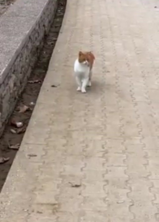 n orange and white cat walking toward the camera on a light gray paved path