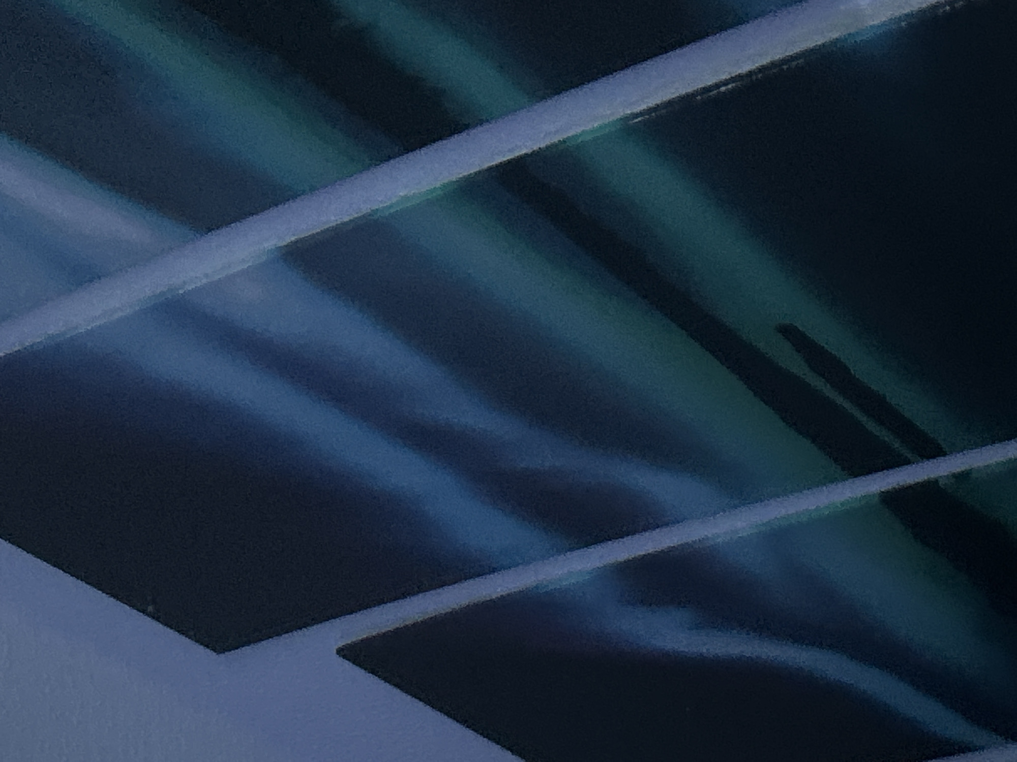 An interior scene captures a close-up view of a wall displaying a multi-panel artwork. The artwork comprises at least three rectangular panels, vertically oriented and mounted side-by-side with narrow, light-colored vertical gaps between them. The panels feature an abstract design dominated by dark blue and teal gradients, across which several wavy, diagonal streaks of lighter blue and cyan are visible, creating an effect resembling an aurora borealis or flowing light. The wall visible on the left side and partially above the artwork is uniformly painted in a solid light blue tone. No individuals, discernible actions, or interactions are present. The image lacks any identifiable architectural features, unique objects, or environmental cues that would allow for the determination of a specific location within Karlsruhe, Germany.