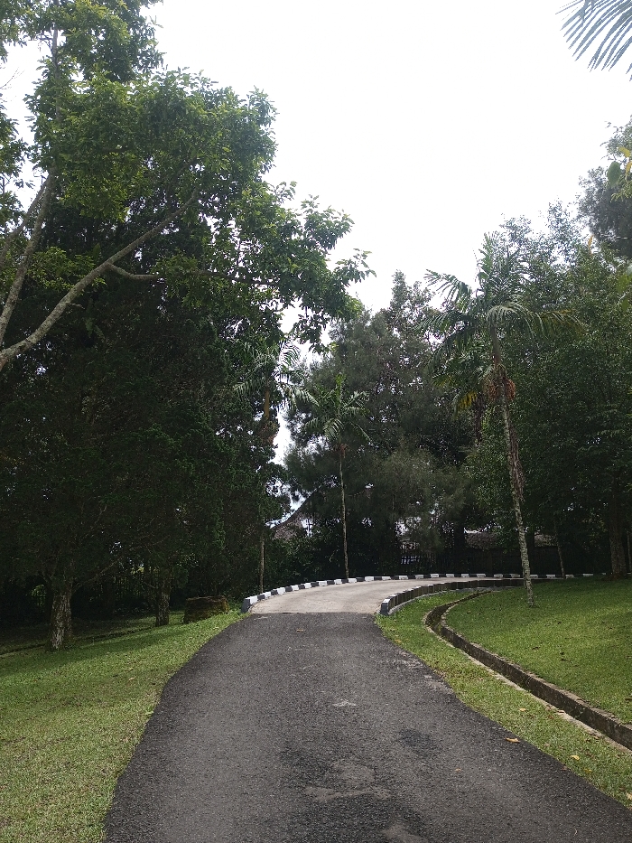 A paved road curves gently through a green landscape. Lush trees and greenery line the path on both sides, creating a secluded atmosphere. A building is visible in the distance. The road is smooth and well-maintained, with a painted curb. The grass is neatly trimmed and the overall scene evokes tranquility and natural beauty.