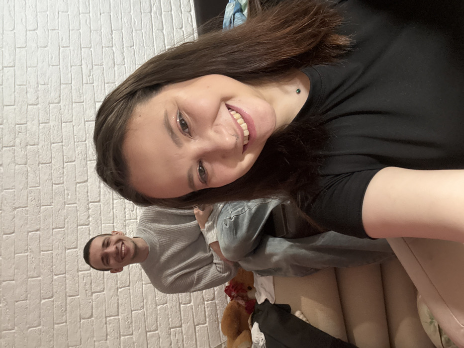 The depicted scene is an indoor setting, reportedly in Saratov, Russia. A female subject is positioned in the foreground, occupying the lower right and center of the frame, taking a selfie. She has long dark brown hair, fair skin, and is smiling broadly at the camera, revealing her teeth. She wears a black short-sleeved t-shirt, a small ring piercing in her left nostril, and a small green jewel on her upper chest. Behind the female, to the left, a male subject is seated on a light-colored sofa. He has short dark hair, fair skin, and is also smiling at the camera. He is wearing a light grey, ribbed, long-sleeved turtleneck sweater and light blue jeans, with his legs crossed at the ankles. The background wall is white with an artificial brick texture. To the immediate left of the seated male, on the sofa, a light brown teddy bear, a white plush animal with a red bow, a folded black garment, and a folded white cloth are visible. A dark-colored sofa or armrest is partially visible on the far right, topped with a light blue patterned blanket or cloth. The scene is illuminated by ambient indoor lighting.